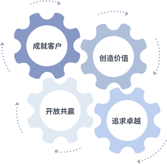 成就客户是一切决策的出发点,,,,创造价值是衡量所有工作的标准,,,,追求卓越是我们做事做人的态度,,开放共赢是我们的格局也是最终的结果。。价值观的齿轮环环相扣,,,推动着组织里的每个人不断向前。。。。